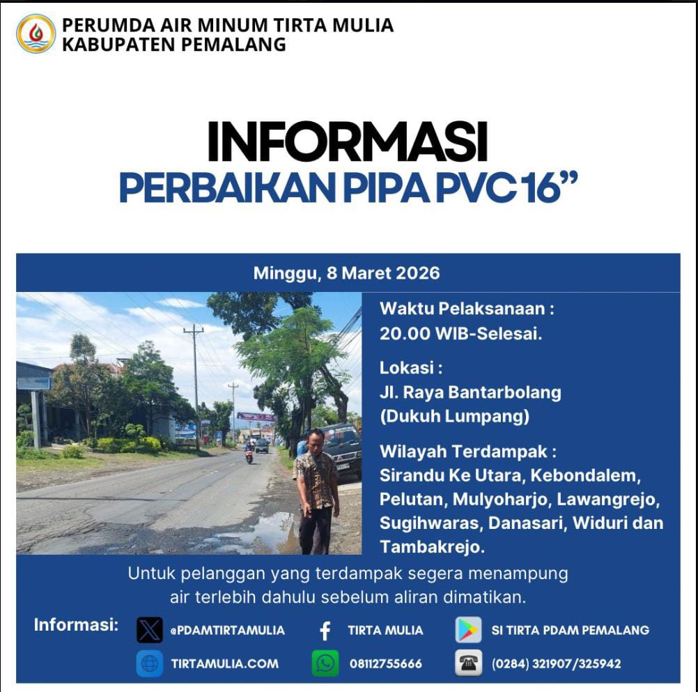 ​Berdasarkan rilis resmi manajemen melalui akun X pada Sabtu (7/3/2026), perbaikan akan difokuskan pada pipa PVC berdiameter 16 inci di lokasi Jalan Raya Bantarbolang, Dukuh Lumpang, Kabupaten Pemalang.